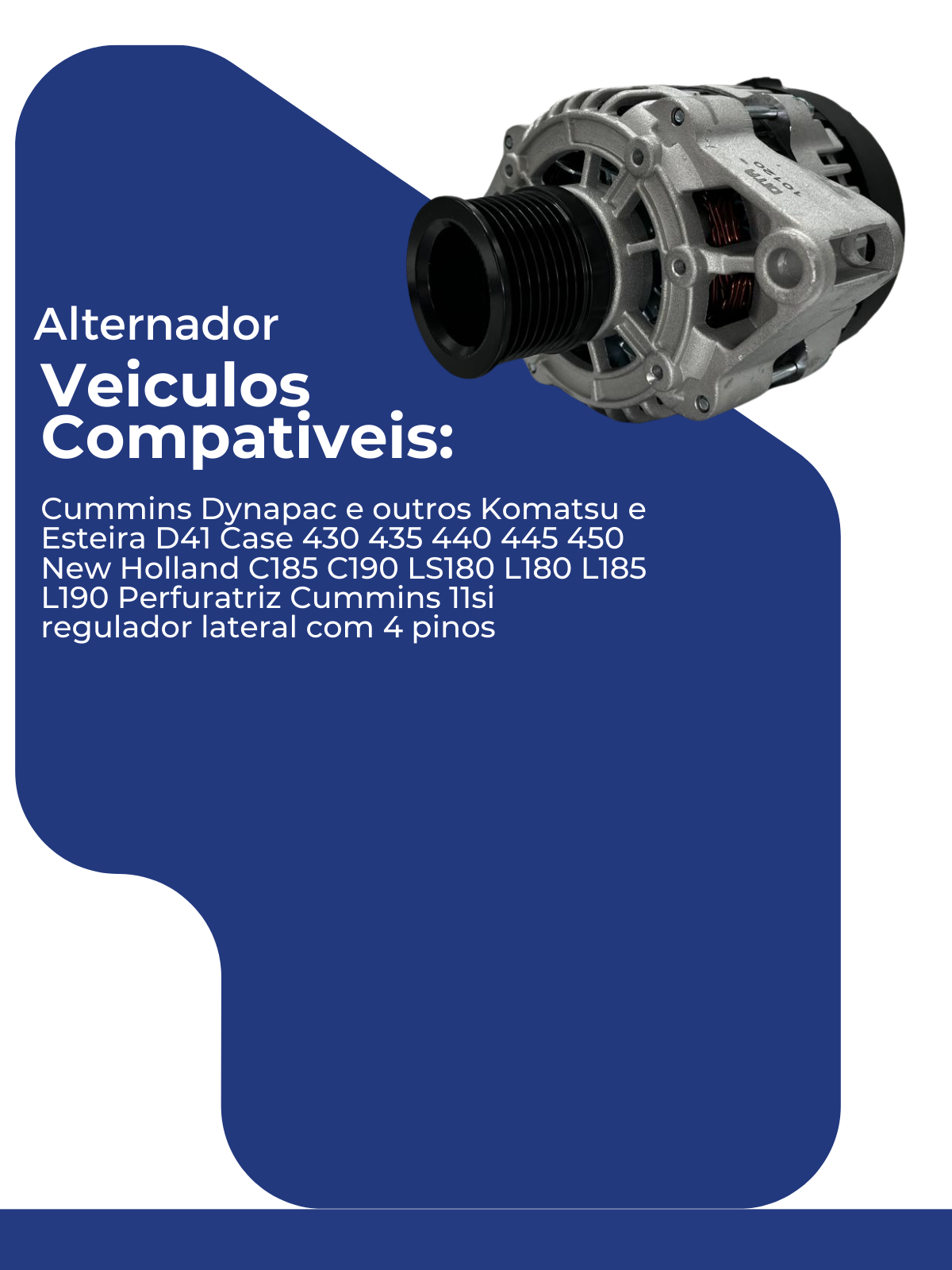 Alternador 12V 95A com regulador lateral de 4 pinos, ideal para uso em máquinas pesadas, perfuratrizes, tratores e equipamentos industriais. Compatível com motores Cummins e aplicações em marcas como Dynapac, Komatsu, Case e New Holland, oferecendo robustez e eficiência elétrica mesmo em condições severas de trabalho. Produto indicado para substituição com excelente desempenho e durabilidade.